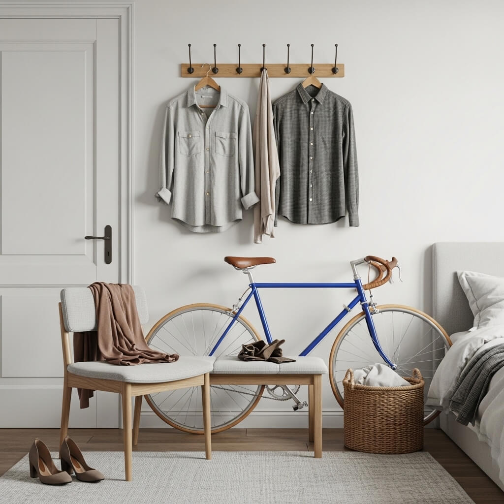 Many bedrooms have a chair, bench, or bike that collects clothes that aren’t clean enough for the closet but not dirty enough for the hamper.