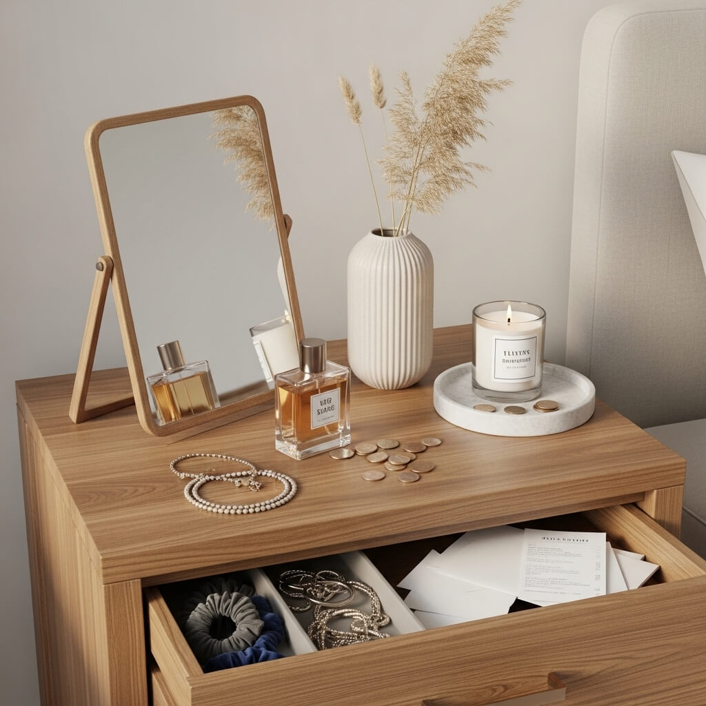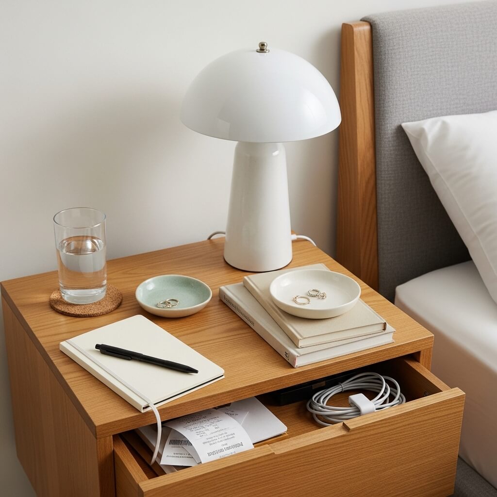 Nightstands often gather clutter—water glasses, chargers, half-read books, and receipts.