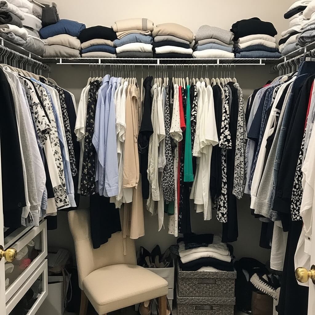 A messy closet spills into the bedroom. When you can’t find clothes, they end up on chairs or the bed.