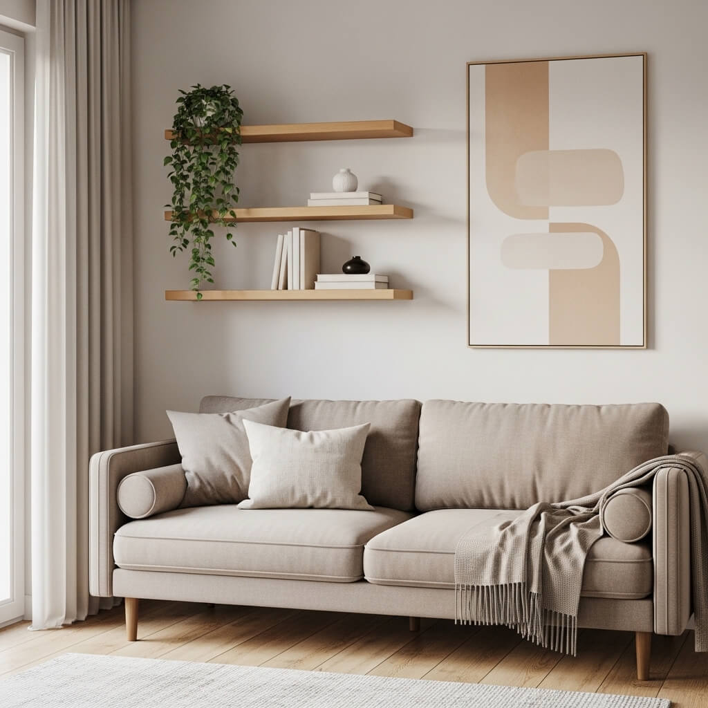 Curate them carefully to avoid clutter. Display a few items: a trailing plant, a couple of stacked books, or a piece of neutral art.