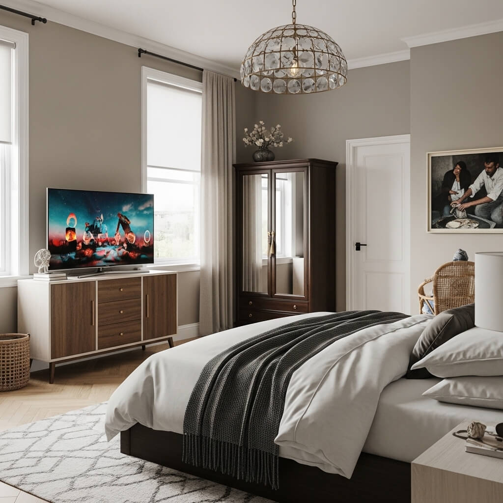 To declutter your bedroom energy, remove as much technology as you can. If you must have a TV, choose one that displays art when off or hide it in a cabinet.