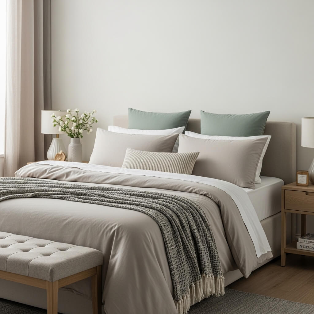 Adopt a modern look by simplifying your linens. Choose high-quality, breathable fabrics in soft, neutral tones like oatmeal or sage green.