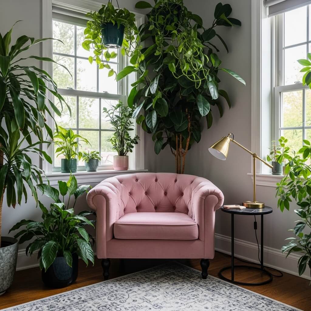 - The Focal Point: Place a plush, tufted velvet armchair in a soft, dusty pink hue in the corner of the room, ideally near a window.