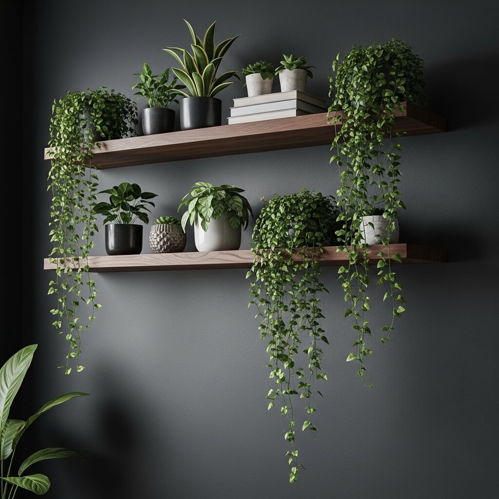 - The Display: Use these shelves exclusively for trailing plants. As the vines grow and drape downward, they create a living curtain of greenery. This draws the eye upward, emphasizing the height of the room, and adds an incredible, wild texture to the dark, flat walls.