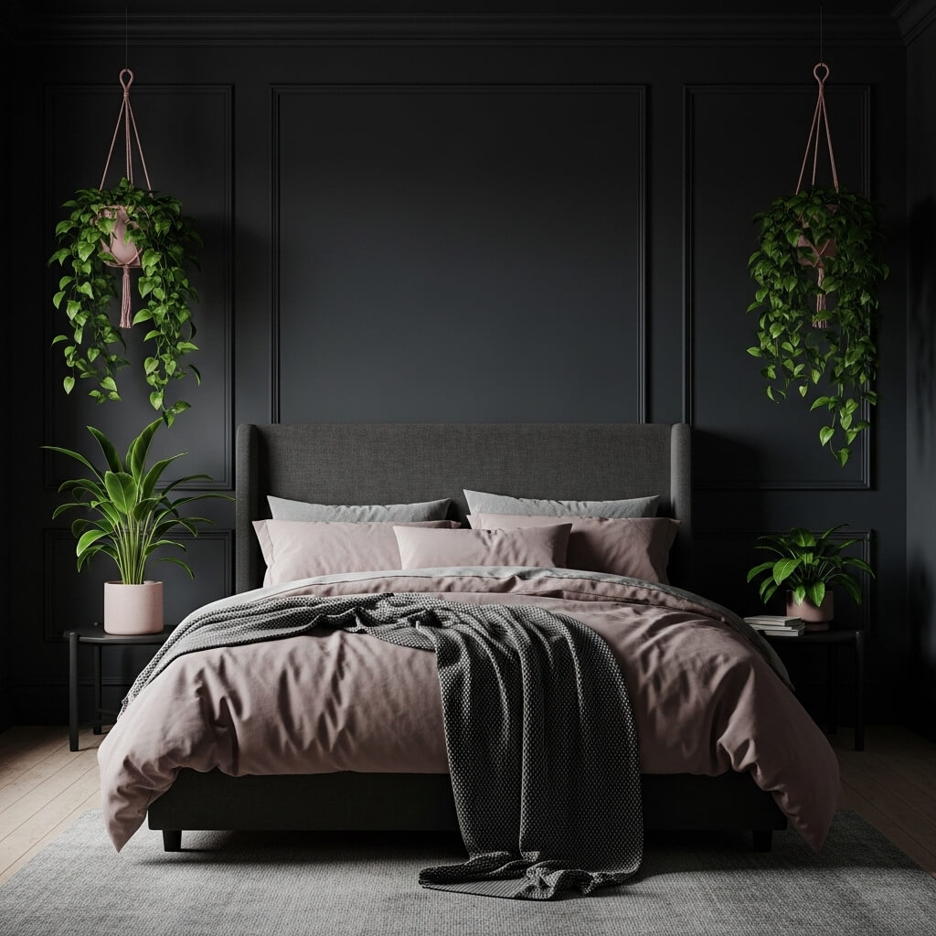 - The Aesthetic Impact: Light-colored walls wash out the visual impact of plant foliage. A dark, moody background acts as a theatrical backdrop, causing every single green leaf to leap forward visually. It immediately transforms a standard bedroom into a cozy, cave-like retreat that feels profoundly restful and visually dramatic.