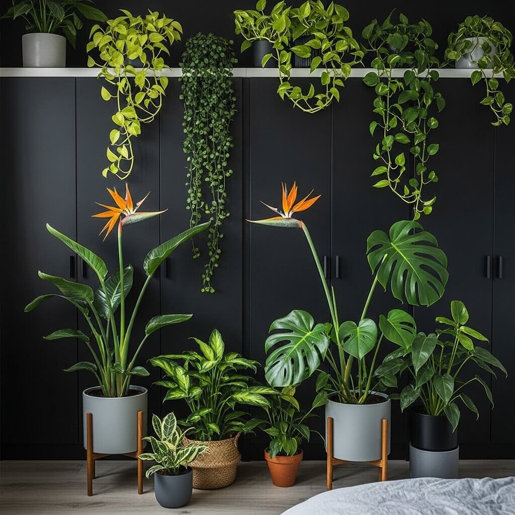 | Decor & Plants | Ambient grow lights, dark pots. | Massive Monstera, vintage gold mirrors. | Sleek, modern floating shelves. |