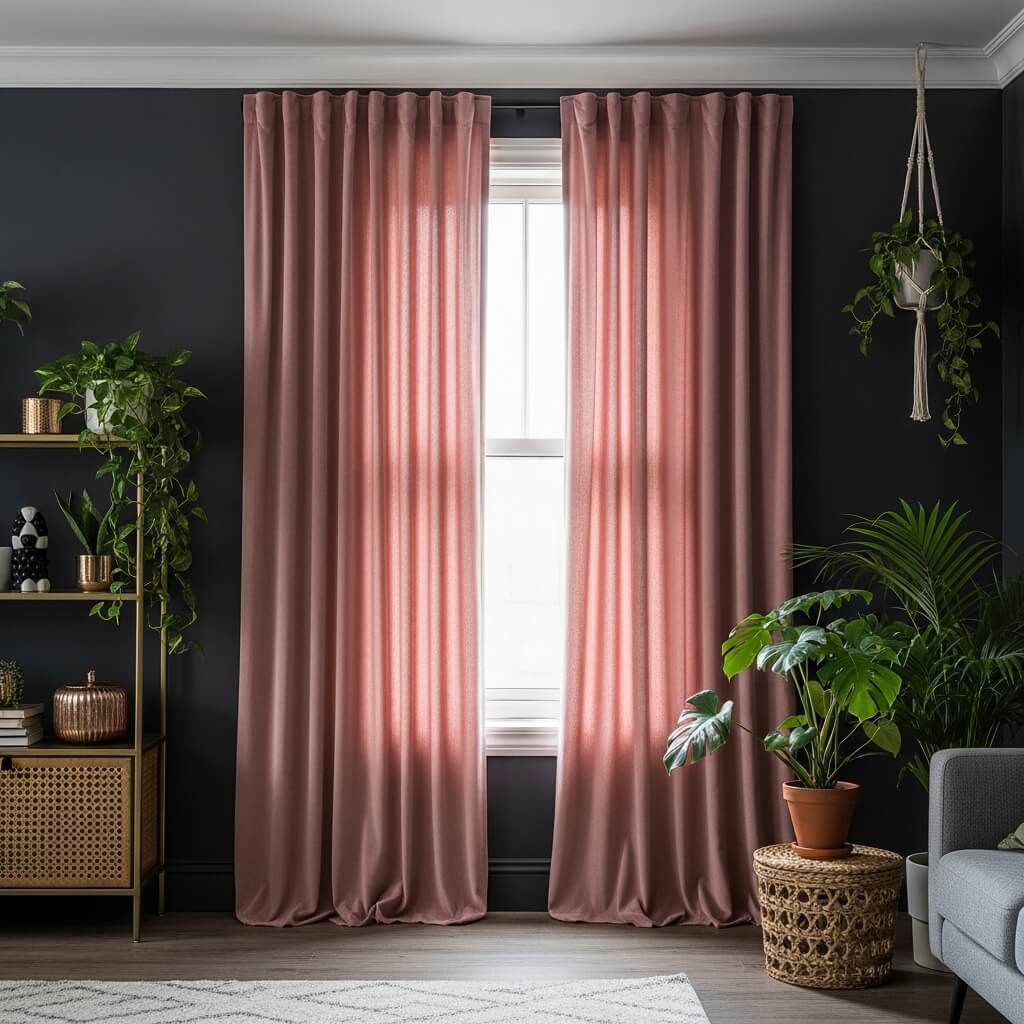 - The Design Element: The pink curtains serve as a visual bridge. They soften the harshness of the dark paint and provide a romantic, vintage warmth that perfectly complements the green of your bohemian plant collection. Mount the curtain rod as close to the ceiling as possible to make the room feel endlessly tall.
