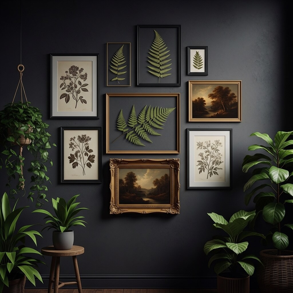 - The Curation: Create an asymmetrical gallery wall using vintage, sepia-toned floral sketches, pressed ferns in floating glass frames, and dark, moody landscape oil paintings.