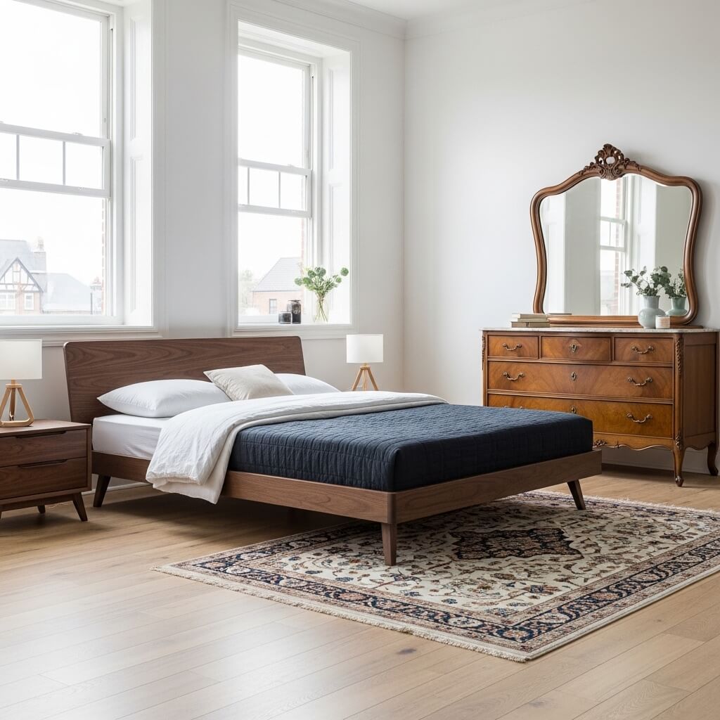 - The Rug Choice: Place a heavily distressed, vintage Persian or Turkish rug beneath the modern platform bed.