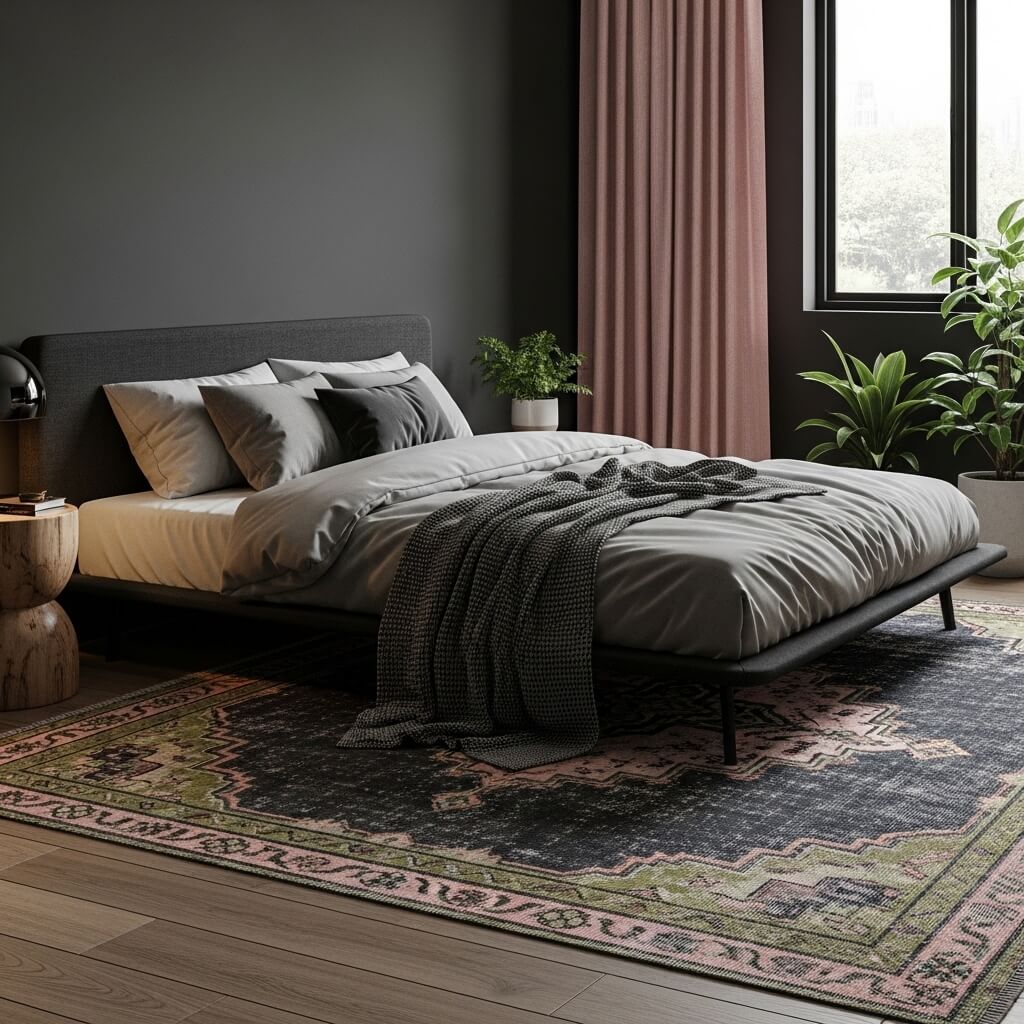 - The Color Tie-In: Look for a rug that features deep, saturated colors—like charcoal or navy—but specifically features woven accents of dusty pink and olive green. This singular piece ties the entire complex color palette (the dark walls, the pink curtains, the green plants) together in one beautiful, tactile foundation.