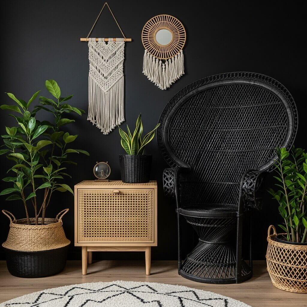 - The Design Choice: While bright, blonde rattan is beautiful, a moody room calls for darker textures. Incorporate dark-stained wicker baskets for your plant pots, or a vintage, black-painted rattan peacock chair.