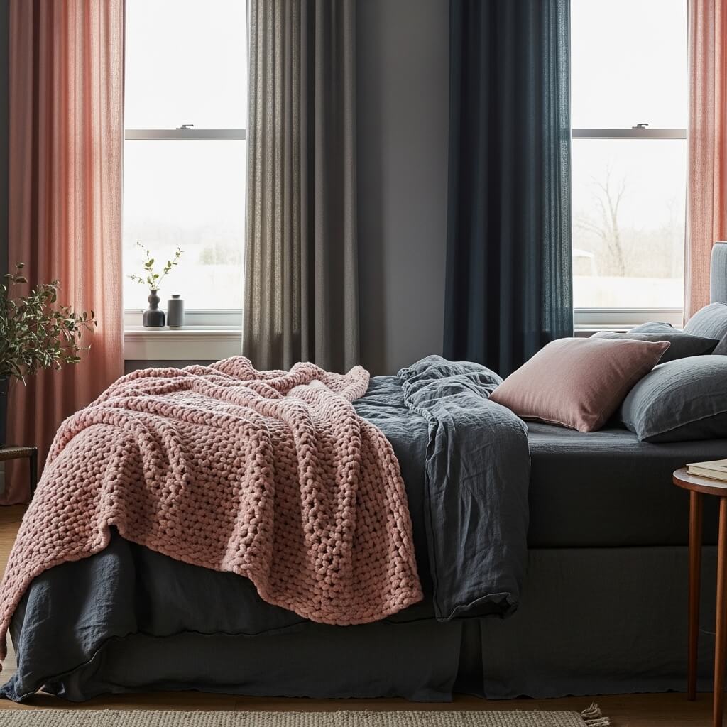 - The Cozy Factor: This “messy-chic” layering technique invites you to sink in. The dark base maintains the moody aesthetic, while the pink layer ties perfectly back to your statement curtains, creating a cohesive, professionally designed look.