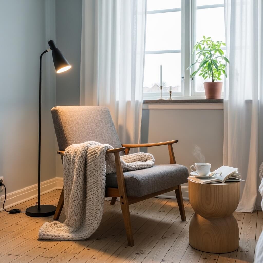 - The Accessories: Drape a soft throw blanket over the chair, add a small wooden stool for tea, and position a sleek floor lamp nearby for a cozy nook.