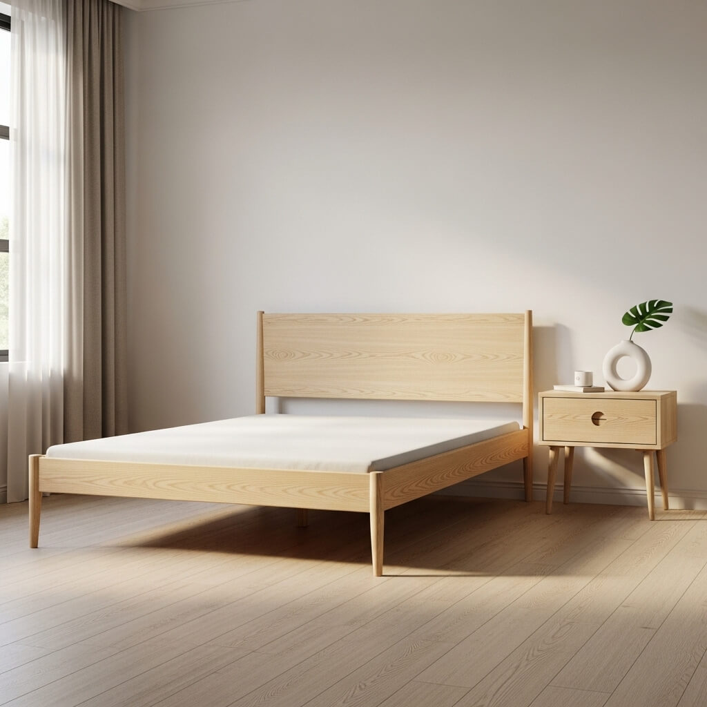 - The Details: Look for nightstands with cut-out handles. A simple bed frame of solid oak or birch offers an elegant foundation.