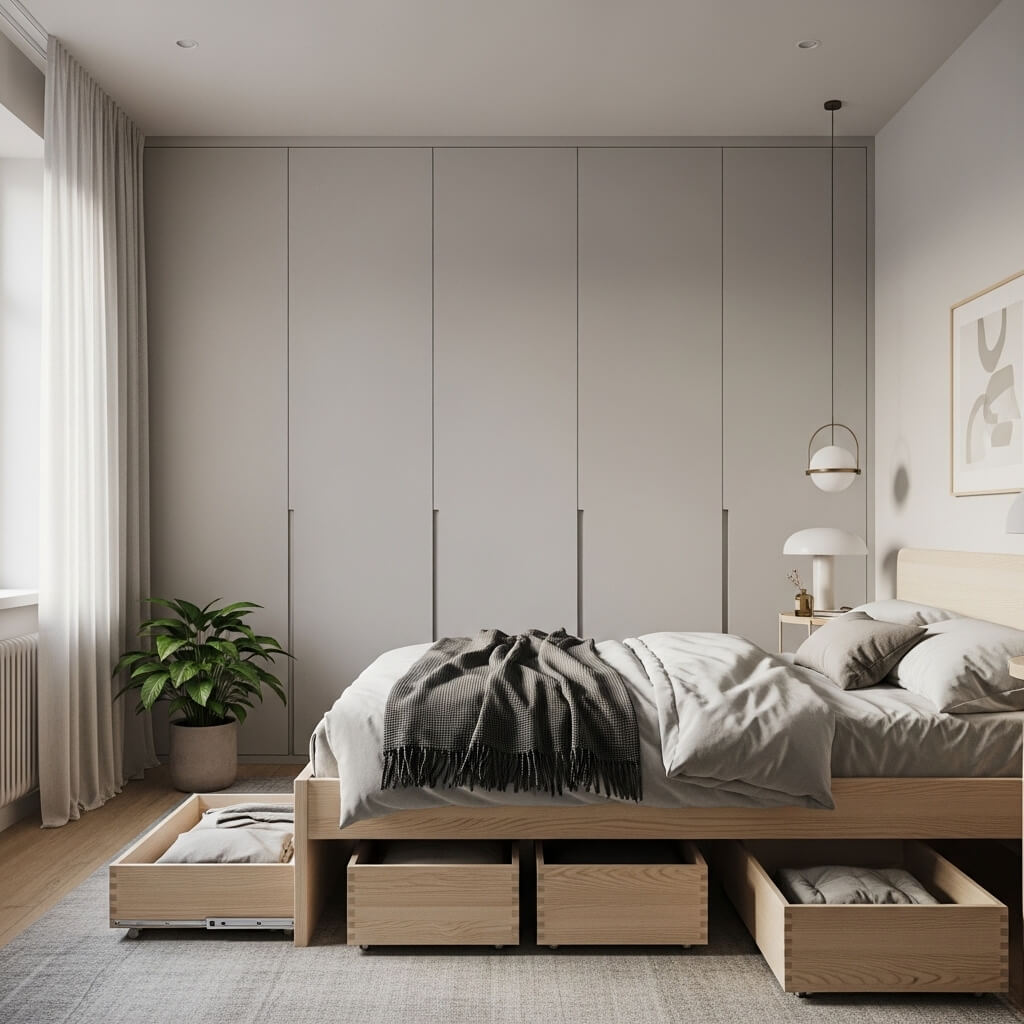 - Built-In Wardrobes: Opt for floor-to-ceiling wardrobes matching your walls, with push-to-open doors.