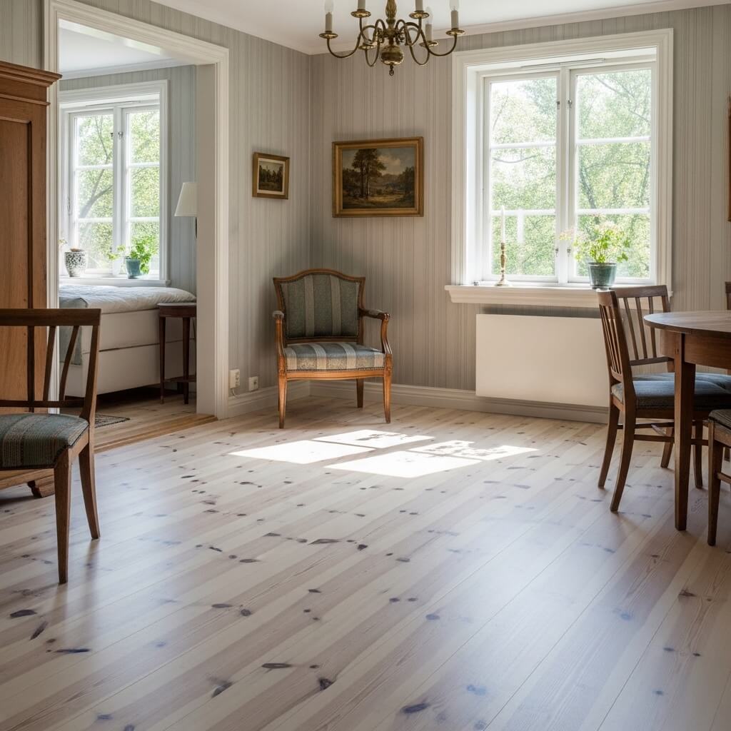 - The Finish: Light woods like pine, ash, or beech are preferred. They often have a white lye or soap finish, giving a pale, organic look underfoot.