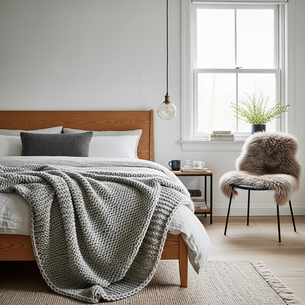 - The Mix: Contrast is key. Drape a chunky-knit wool blanket over the bed’s foot. Toss a high-quality faux Icelandic sheepskin rug on a sleek chair.