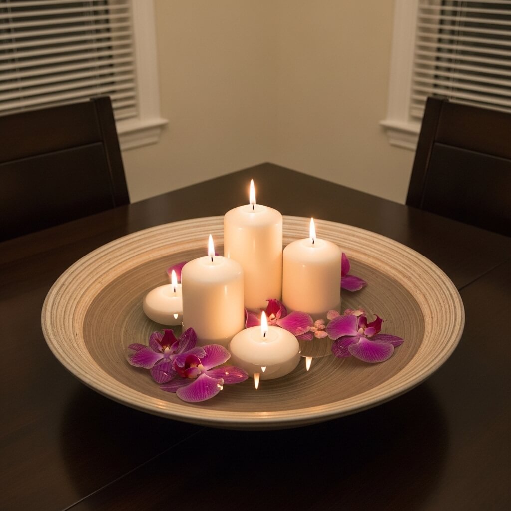 - The Setup: Place a large decorative bowl in the center of your dining table. Fill it with water and float three to five large white candles alongside a few orchid blossoms.
