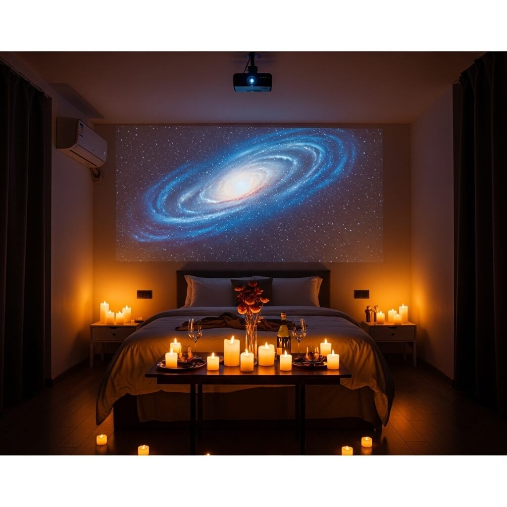 - The Setup: Clear the room of clutter and use a galaxy projector to cast a slow-moving nebula across the ceiling.