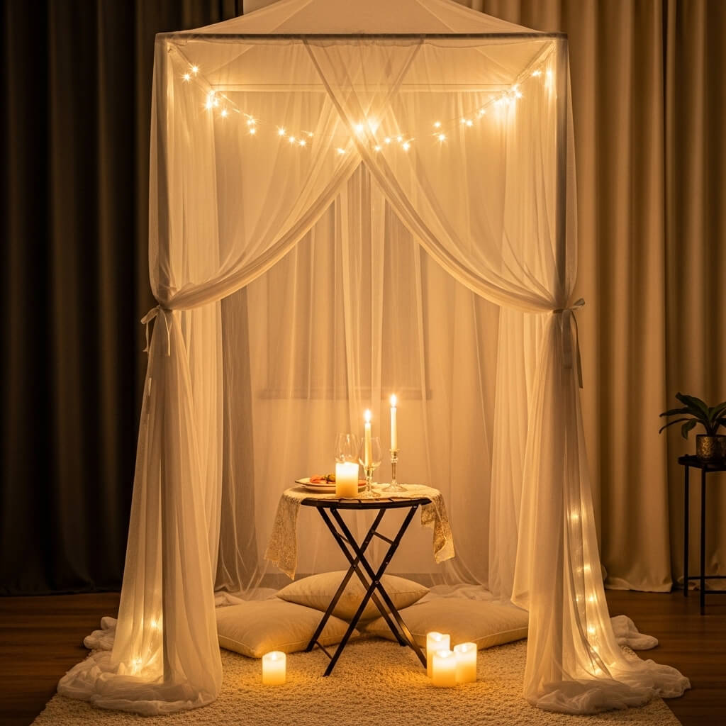 - The Setup: Drape sheer white fabric or mosquito netting from the ceiling, allowing it to pool around your small bistro table.