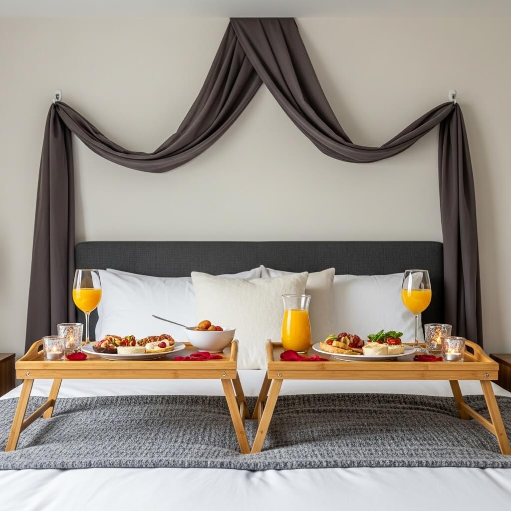 - The Setup: Use two matching bamboo or wooden bed trays. Arrange them side-by-side so you are facing each other while sitting against the headboard.