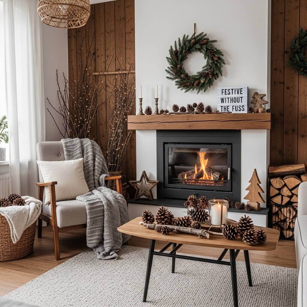 Use natural elements like pinecones and branches for cheap, elegant decoration.