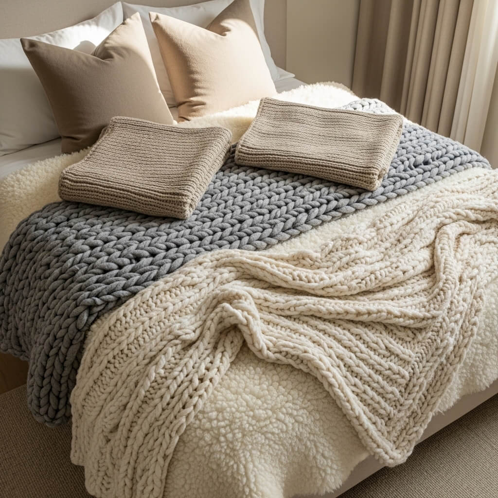 I aggressively layer thick, chunky knit blankets to build incredible visual depth.