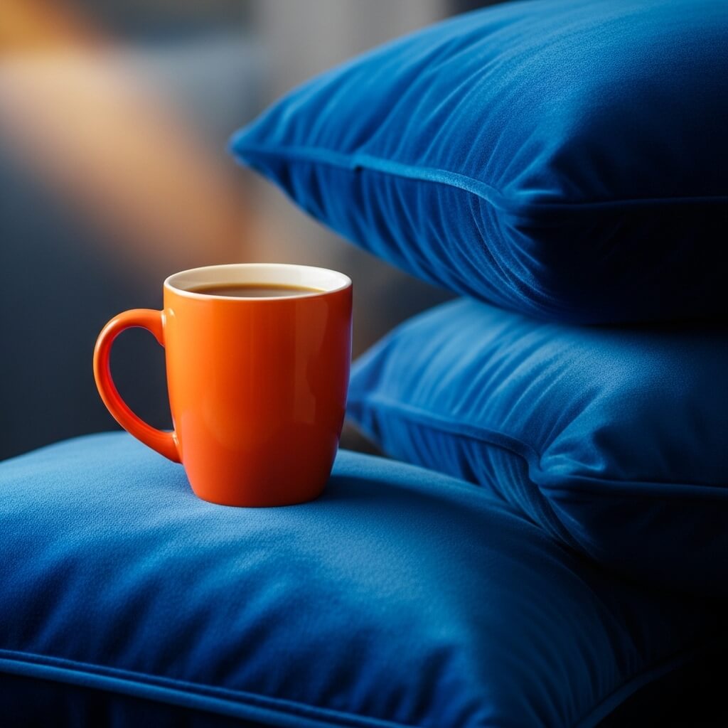You instantly grab attention when you pair a bright orange mug with deep blue pillows.