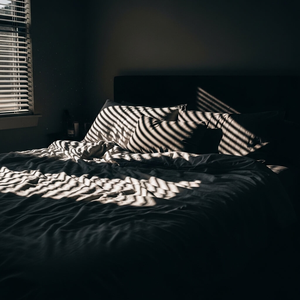 I purposely partially close my blinds to cast long, dramatic shadows across the bed.