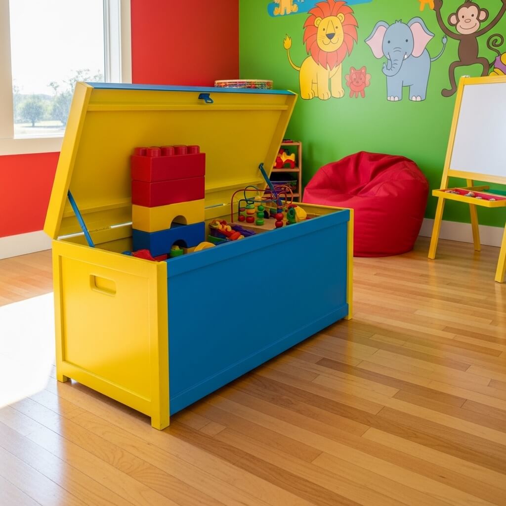 A heavy-duty toy chest keeps the bedroom kids floor totally clear underneath.