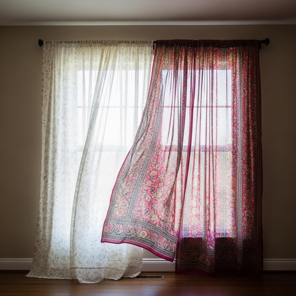 - The ‘After’ (The DIY): Creating breezy curtains from upcycled materials. Source vintage, lightweight silk saris or sheer block-printed cotton yardage. Sew simple rod pockets and hang them high and wide above the window frame to let the maximum amount of filtered, colorful light into the room.