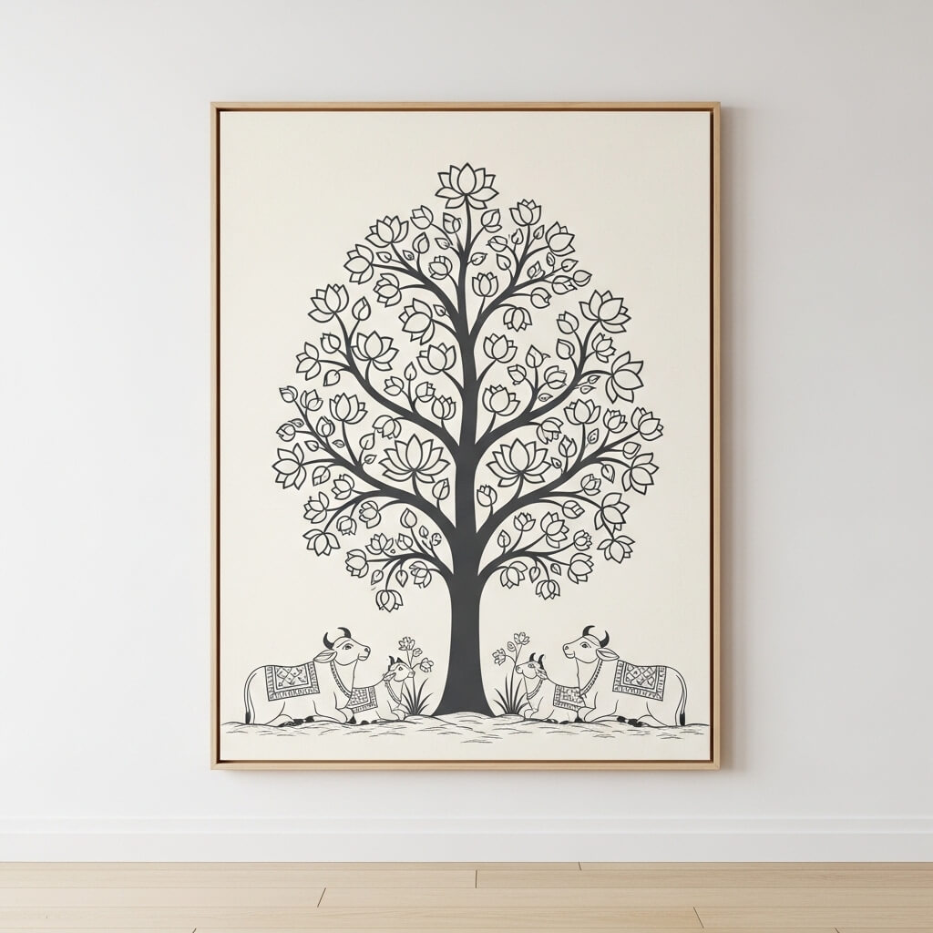 - The ‘After’ (The DIY): A modern, oversized take on Pichwai art. Buy a large, blank canvas. Using a minimalist color palette—perhaps just charcoal grey on a cream background—paint a simplified, oversized lotus motif or a sprawling Tree of Life. Frame the canvas in a simple, raw wood float frame.
