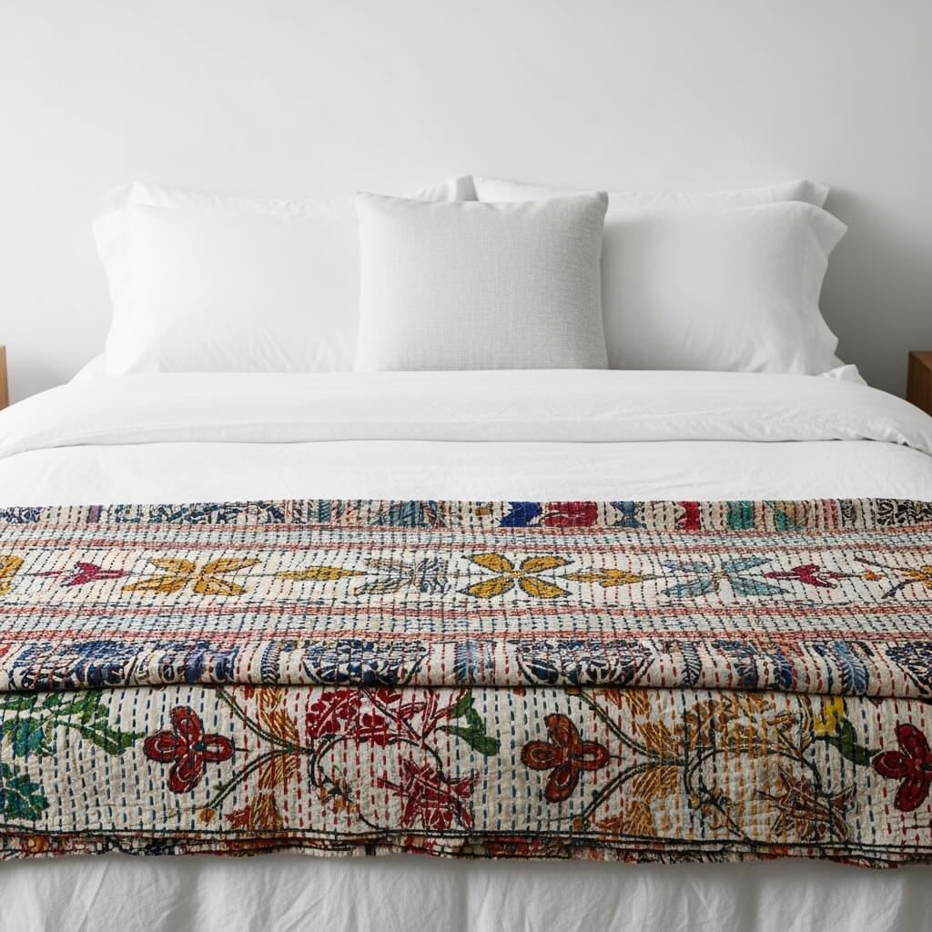 - The ‘After’ (The DIY): Layering for luxury. Keep your base sheets in crisp, bright white cotton or linen. Fold a beautifully stitched, vintage Kantha quilt horizontally across the foot of the bed. The vibrant, contrasting threads and unique patterns instantly give the bed character.