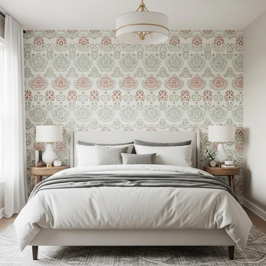 - The ‘After’ (The DIY): A stunning, hand-stenciled accent wall. Using a large wall stencil inspired by traditional Rajasthani block prints, you can roll on a soft, muted color—like sage green or terracotta—over a crisp white base.