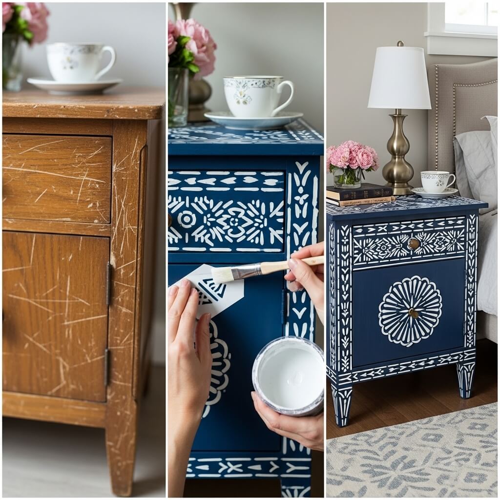 - The ‘After’ (The DIY): The faux bone inlay technique. Paint your piece of furniture a solid base color (like deep indigo, charcoal, or emerald green). Then, use a specialized bone inlay stencil and a foam roller with white chalk paint to mimic the intricate, geometric floral patterns of real inlay. Finish with a clear protective wax.