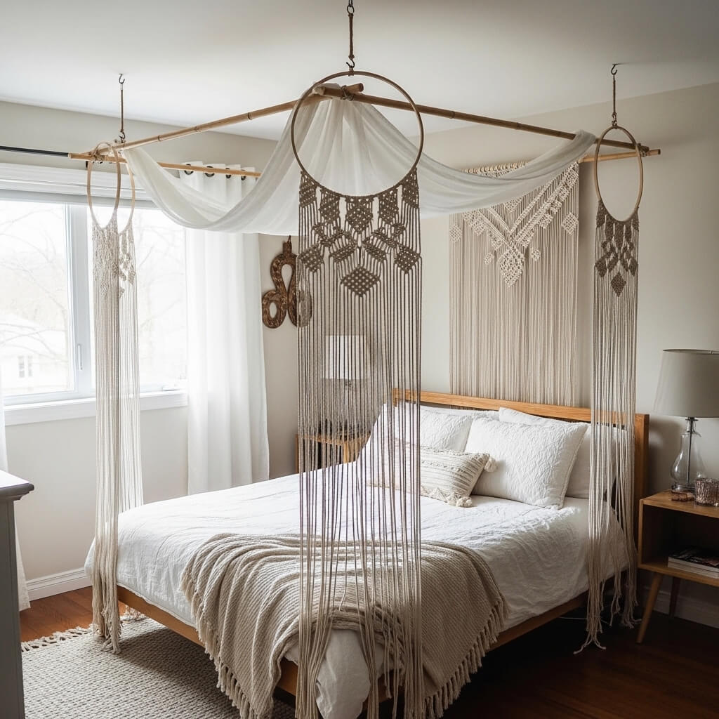 - The ‘After’ (The DIY): Create a bohemian, floating canopy. Suspend a large wooden embroidery hoop or a lightweight bamboo frame from the ceiling using secure hooks. Drape lengths of lightweight muslin or hand-knotted macrame over the hoop, allowing the fabric to cascade down the sides of the bed.