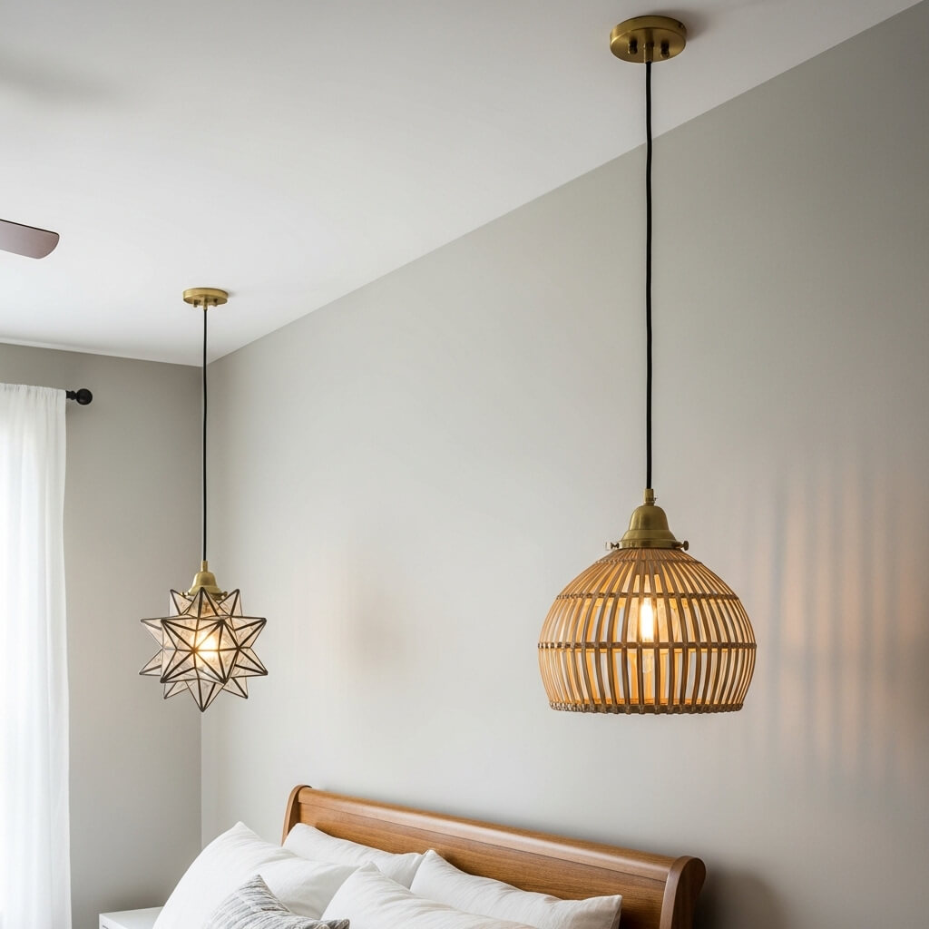 - The ‘After’ (The DIY): Swap out the basic fixture for a pair of hanging pendant lights suspended over the nightstands. You can create a DIY fixture by taking a simple brass pendant kit and pairing it with a Moravian star glass shade or a woven bamboo basket for a softer, diffused glow.
