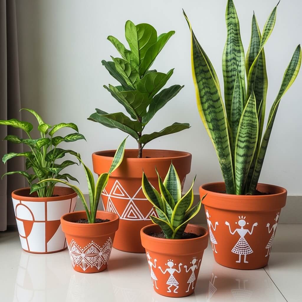 - The ‘After’ (The DIY): Purchase affordable terracotta pots and customize them using white acrylic paint. You can paint minimalist geometric shapes, traditional Warli art figures, or simple Mandala dot patterns. House large, lush tropical plants like a Ficus Audrey or a Snake Plant in them.