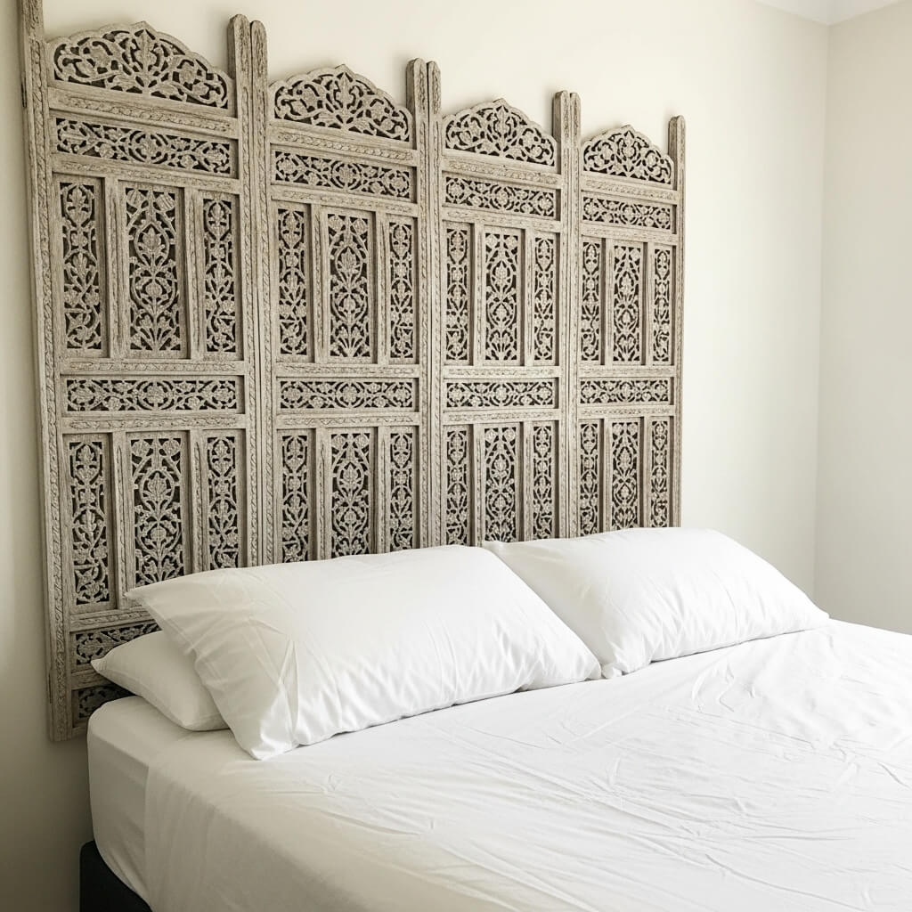 - The ‘After’ (The DIY): Sourcing a vintage carved wooden screen or room divider from a flea market or thrift store. By sanding it down and applying a light limewash or matte white sealant, you preserve the intricate Indian motifs while giving it a fresh, minimalist boho-chic vibe. Mount it securely to the wall behind your mattress.