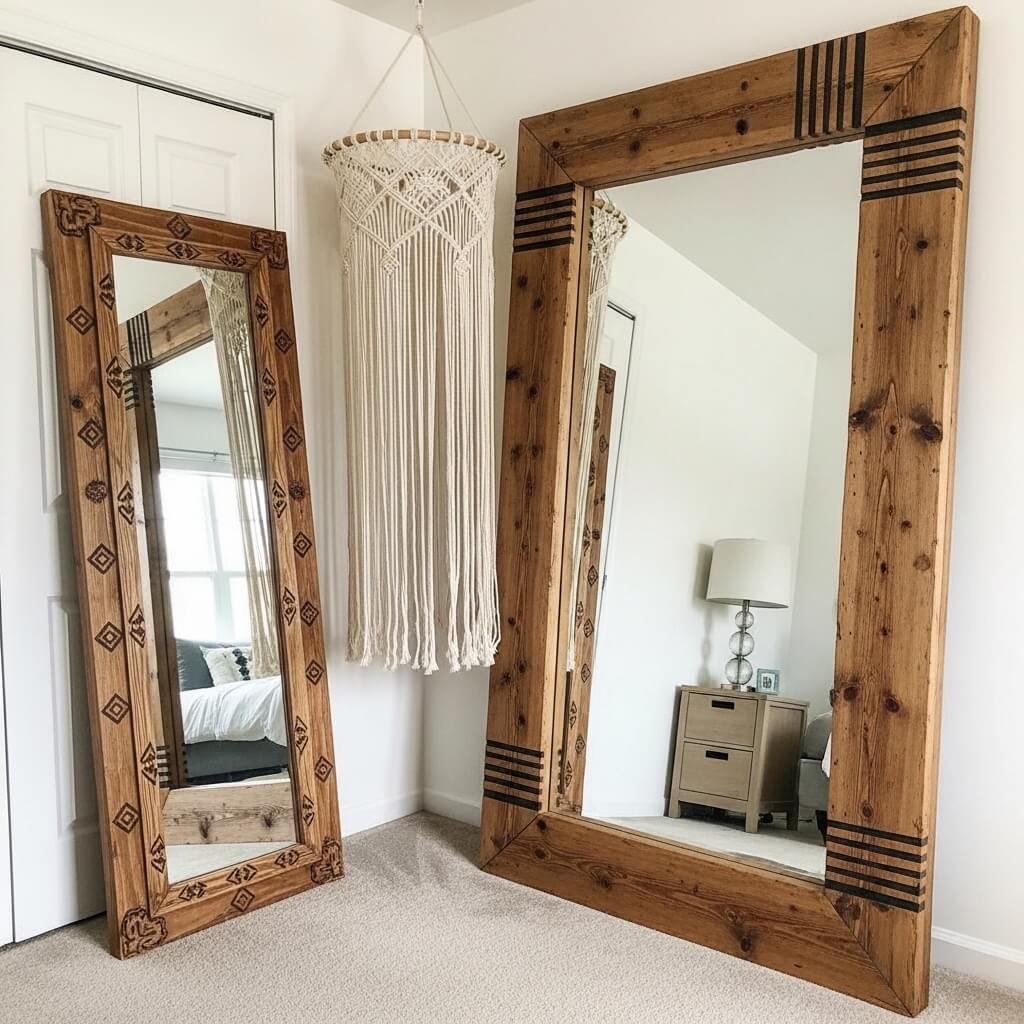 - The ‘After’ (The DIY): Build a chunky, rustic frame for a large floor mirror using reclaimed wood. You can distress the wood, stain it a warm walnut, or even carve simple geometric patterns into the edges to mimic the rustic doors of rural Indian homes. Lean the massive mirror against the wall in a corner of the room.