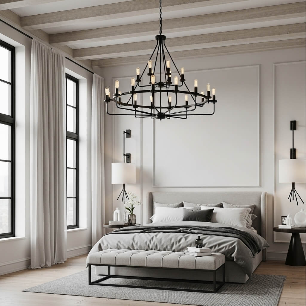 - Drop a massive light fixture directly over the center bed.