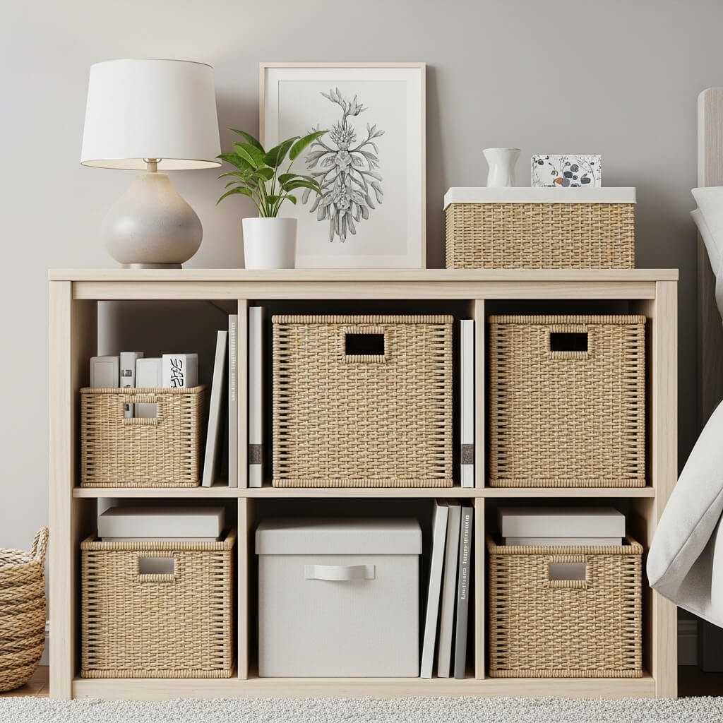 I fiercely protect my Master modern vibe by hiding everyday junk inside sleek woven baskets.