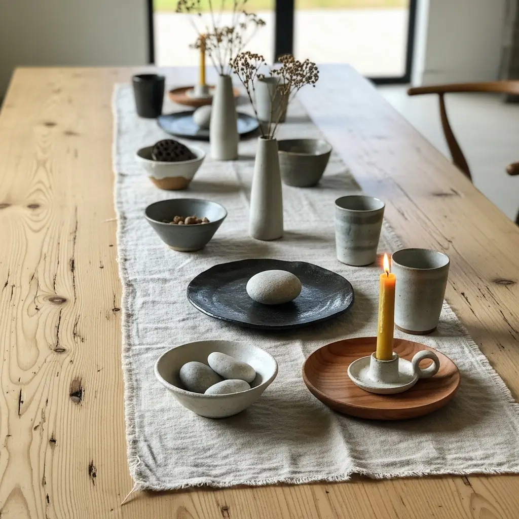 - Drape a raw linen fabric runner casually across the entire wooden surface to add texture.