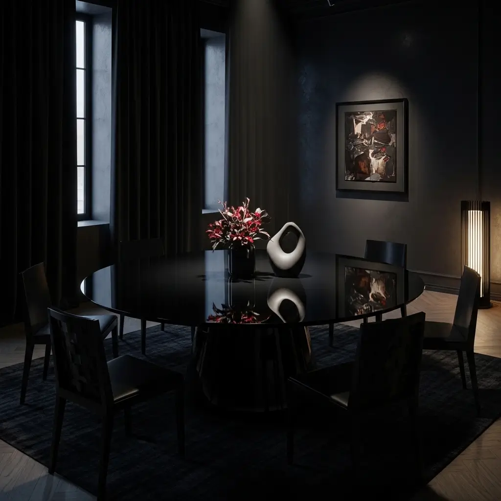I fiercely protect the dramatic vibe of my Black and Black round furniture.
