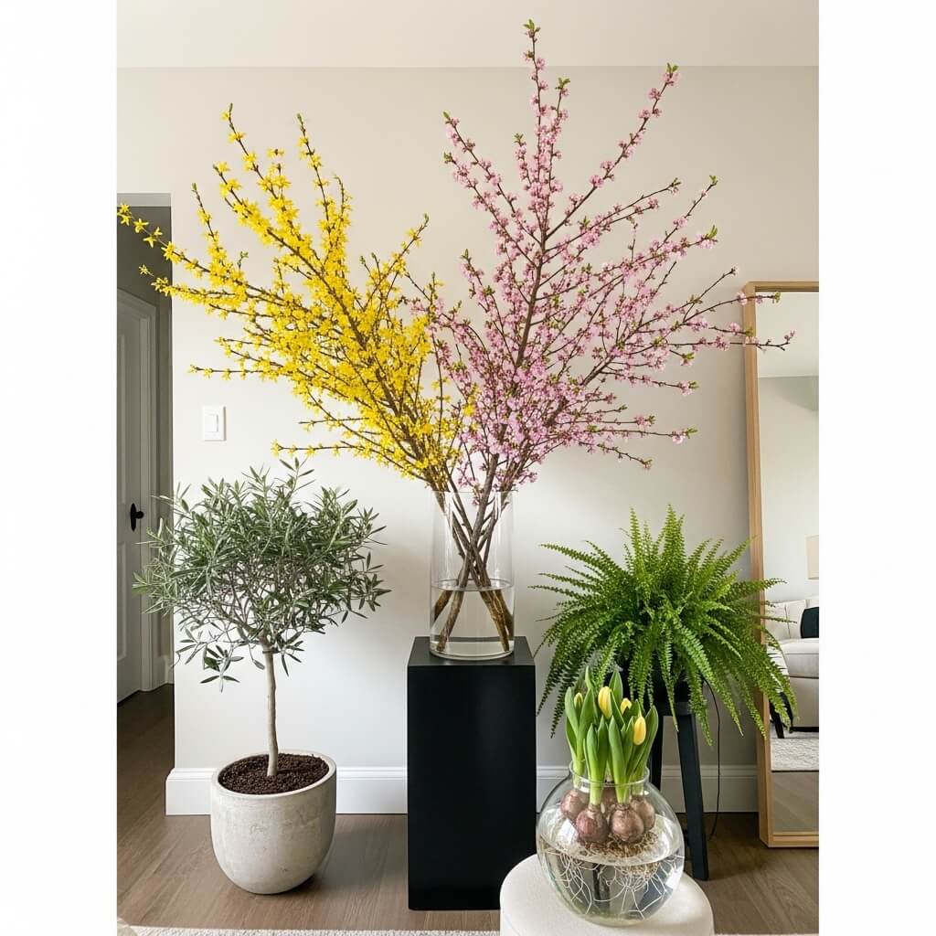 Rather than a traditional bouquet, 2026 is all about large-scale branches. Think Forsythia (yellow), Cherry Blossoms (pink), or Quince. A single, tall, architectural branch in a heavy floor vase creates a stunning focal point that feels like a piece of art.
