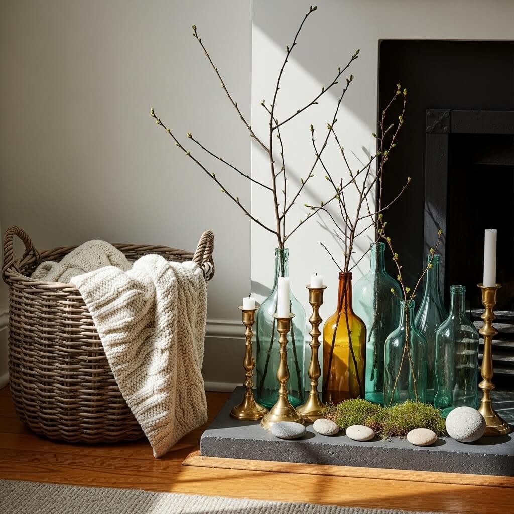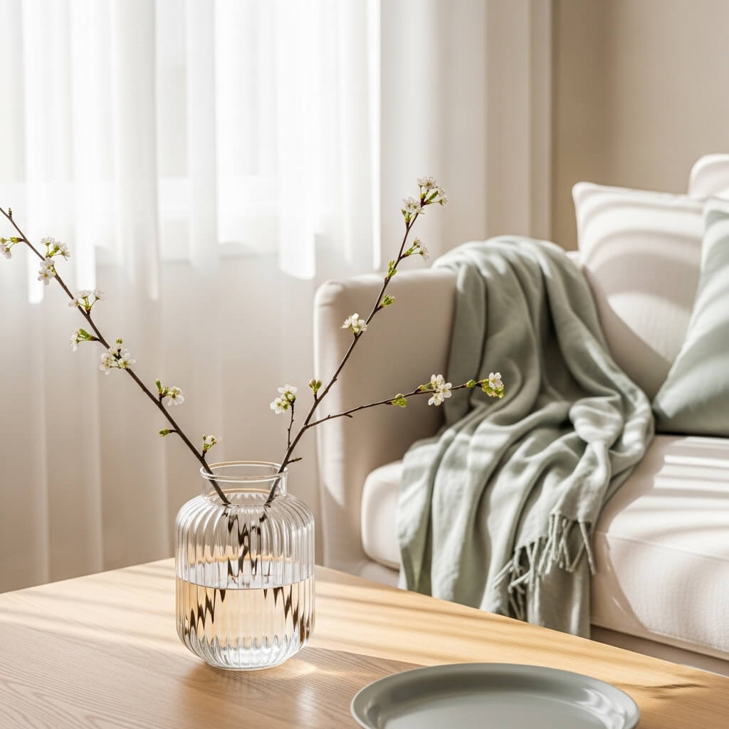 • The Coffee Table: Create a “living” centerpiece. Instead of just books, add a small bowl of green moss or a cluster of small bud vases, each holding a single stem.