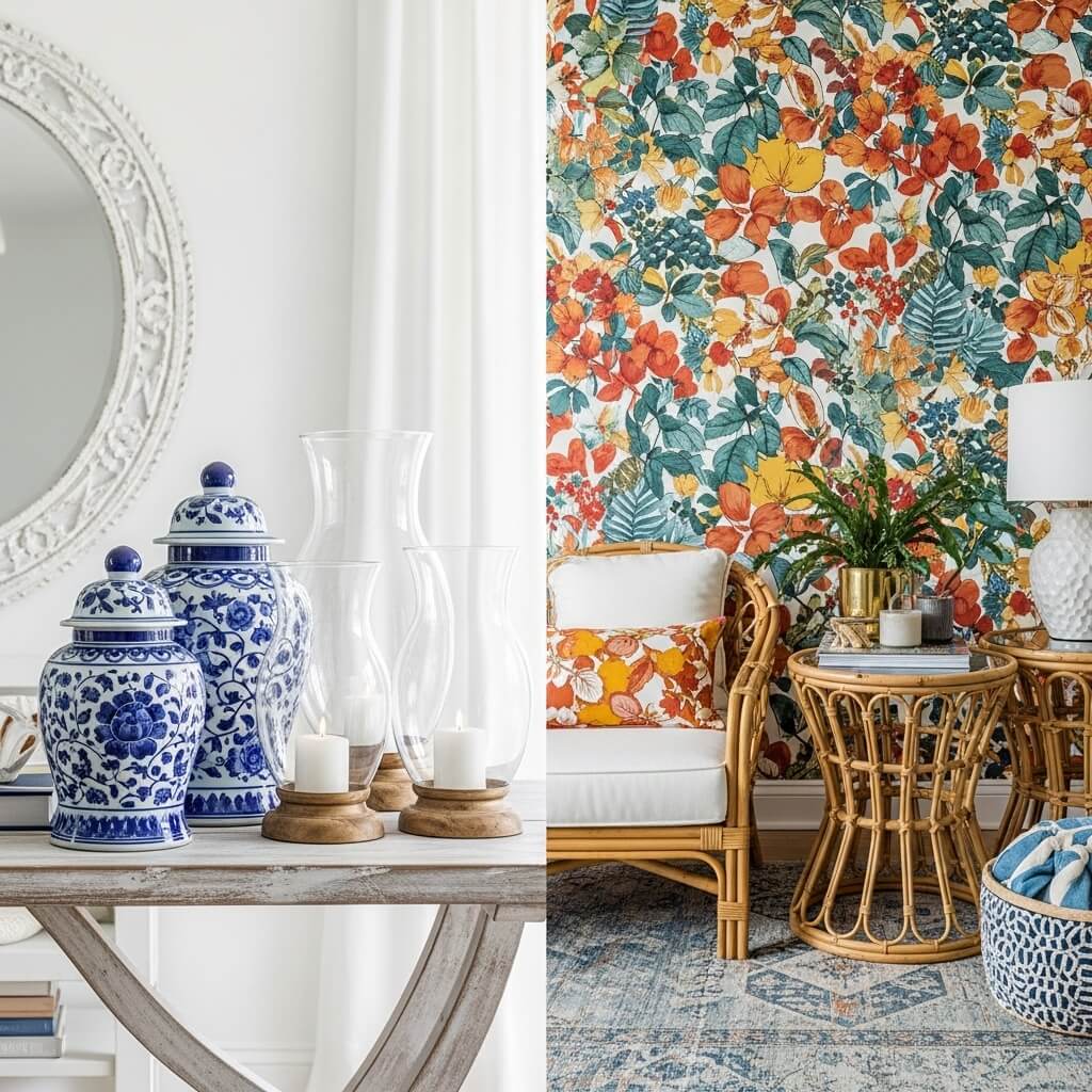 • Key Elements: Rattan furniture, bold floral prints, brass accents, and “hot” colors like terracotta, mustard, and teal.