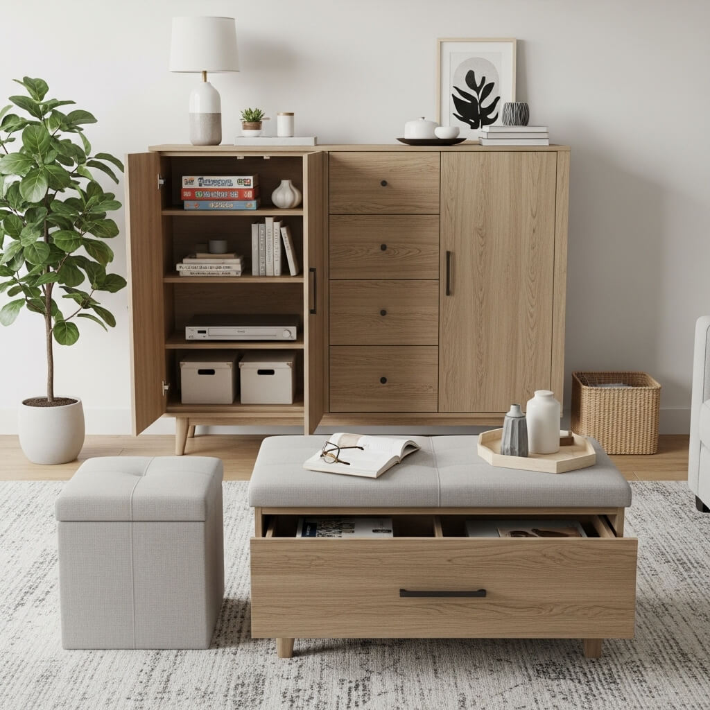 When picking furniture, look for items that do double duty: storage ottomans, benches with hidden compartments, or coffee tables with deep drawers.