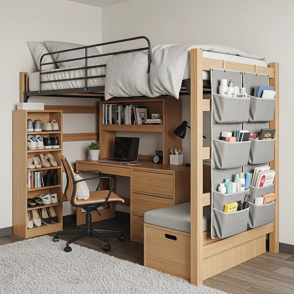 When floor space is limited, go up. Dorm minimalists must use vertical space to its fullest.