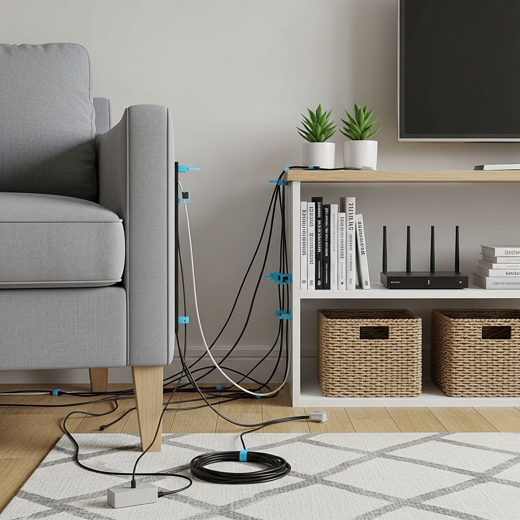 Use zip ties to bundle cables along furniture legs and route wires through walls if possible.